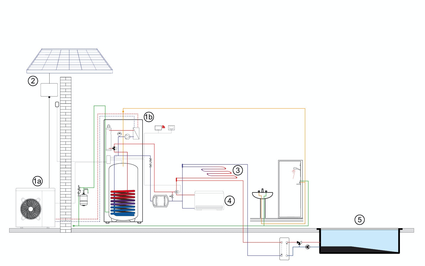 La scelta impiantistica più adatta si è rivelata essere Nimbus Compact 70 S NET, ossia una pompa di calore aria-acqua particolarmente efficiente per il riscaldamento a pavimento e il raffrescamento con fan-coil idronici. La pompa di calore ha un bollitore integrato da 180 litri per assicurare sempre l’acqua calda sanitaria nei bagni. Il sistema si interfaccia all’impianto fotovoltaico da 6 kWp e sfrutta l’energia notturna accumulata dalle batterie, abbattendo notevolmente i consumi. Nimbus Compact 70 S NET è anche collegata ad uno scambiatore in materiale polimerico presente nella piscina, la quale viene riscaldata nelle mezze stagioni fino a 32°C, per sfruttare al massimo il fotovoltaico nel periodo di minor utilizzo.