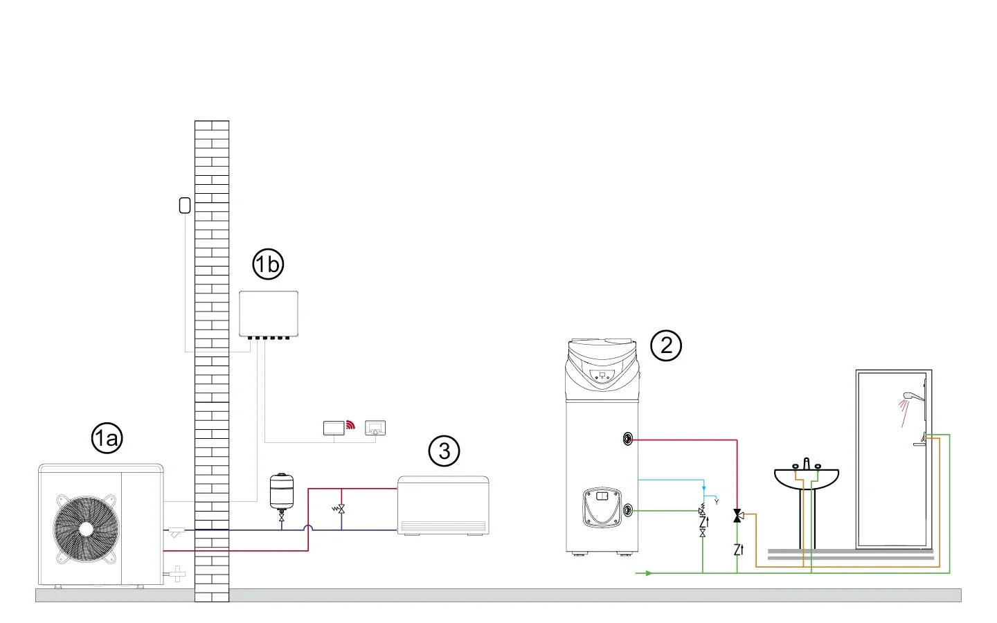 Il concetto impiantistico parte da un riferimento molto alto nella qualità in termini di trasmittanza degli infissi, e delle pareti. Questo permette di avere con un generatore di piccola potenza la possibilità di climatizzare in estate ed in inverno. Las celta interna è con emettitori a fan coil canalizzati con ventilatore inverter. L’acqua calda è prodotta da un sistema a PDC tipo Nuos, da 150 l, che premette di avere allo scarico grossi quantitativi di acqua calda sanitaria. Il sistema diviso con 2 generatori consente di avere la contemporaneità delle richieste